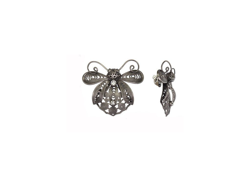 Originální brož vyrobená z filigránových velmi lehkých komponentů. Základním materiálem je slitina mědi a zinku opatřená kvalitní povrchovou úpravou. K výrobě jsou použity výhradně české komponenty převážně z výroby firmy Lucid.. Připnutí jehlou zaručí bezpečnost a stabilitu na klopě saka, šatech, kabelce či šátku. Šperk neobsahuje nikl, mohou je proto bez obav nosit i alergici.