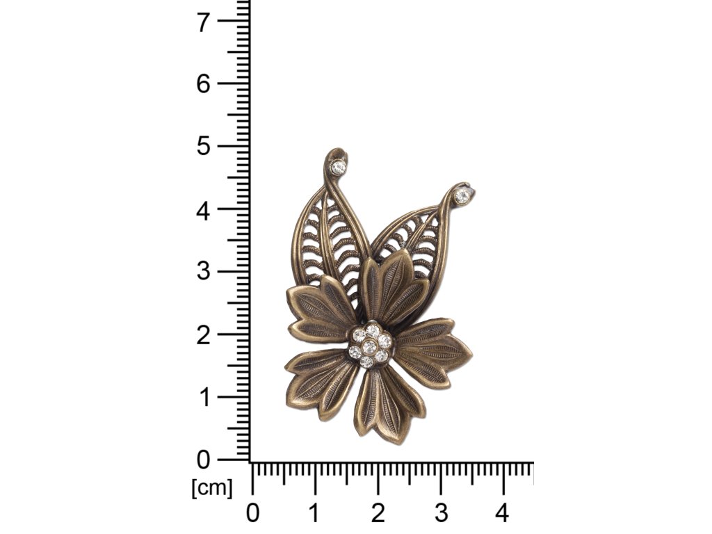 Materiál: tombak, povrchová úprava staromosaz, broušené šatony